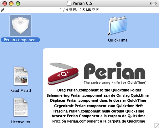 これをインストールすればQuickTimeで大抵の動画は見れるようになります。 具体的には下記の動画形式に対応しています。 AVI、FLV、3ivX, DivX, Flash Screen Video、MS-MPEG4、 Sorenson H.263、Truemotion VP6、Xvid、AVI support for: AAC、 AC3 Audio using A52Codec、H.264、MPEG4、VBR MP3 個人的にYouTubeのFLVも再生できるのがいいですね。 これで毎回落とすたびにiSquintで変換する手間が省けました。 インストール方法は公式サイトのダウンロードから入手して下さい。 Perian_0.5.dmgをダブルクリックしてマウントします。 QuickTimeのライブラリへのショートカットがフォルダ内にすでにありますので、Perian.componentをショートカットへ放り込んで下さい。 これでインストールは完了です。 うまくいかない場合は、/ライブラリ/QuickTimeフォルダに直接コピーしてみて下さい。 これでYouTubeでダウンロードしたFLVファイルも観れるようになるはずなのですが、自分の環境ではなぜか再生されない・・・ 調べたところ拡張子「.flv」を加えないとFLV形式は再生できないようです、ちょっと面倒くさいですね。 次にFLVファイルがQuickTimeで再生されるようにファイルで関連付けを行います。 flvファイルを右クリックし、「情報を見る」を選択します。 「このアプリケーションで開く」で「QuickTime Player」を選択します。 これだけだとこのファイルしか関連付けされないので、その下の「すべてを変更」ボタンを押して関連付けを行って下さい。 これでファイルをダブルクリックするだけでQuickTimeで再生されるようになります。 参考・関連サイト 公式サイト Macの手書き説明書 PR |