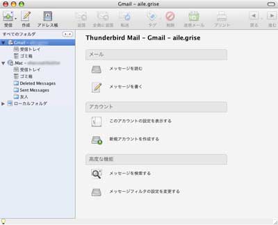 画面はこんな感じです。 Thunderbirdの便利なところはGmailや.Macを選択することができ、アカウントとパスワードを登録するだけで自動的に設定ができます。 今までMacのMailを使用してきましたけど、これもなかなか捨てがたい。 どっちを使うかまだ決めかねているので当分は併用って感じになりそうです。 関連サイト Mozilla Japan |