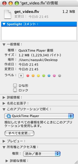 これをインストールすればQuickTimeで大抵の動画は見れるようになります。 具体的には下記の動画形式に対応しています。 AVI、FLV、3ivX, DivX, Flash Screen Video、MS-MPEG4、 Sorenson H.263、Truemotion VP6、Xvid、AVI support for: AAC、 AC3 Audio using A52Codec、H.264、MPEG4、VBR MP3 個人的にYouTubeのFLVも再生できるのがいいですね。 これで毎回落とすたびにiSquintで変換する手間が省けました。 インストール方法は公式サイトのダウンロードから入手して下さい。 Perian_0.5.dmgをダブルクリックしてマウントします。 QuickTimeのライブラリへのショートカットがフォルダ内にすでにありますので、Perian.componentをショートカットへ放り込んで下さい。 これでインストールは完了です。 うまくいかない場合は、/ライブラリ/QuickTimeフォルダに直接コピーしてみて下さい。 これでYouTubeでダウンロードしたFLVファイルも観れるようになるはずなのですが、自分の環境ではなぜか再生されない・・・ 調べたところ拡張子「.flv」を加えないとFLV形式は再生できないようです、ちょっと面倒くさいですね。 次にFLVファイルがQuickTimeで再生されるようにファイルで関連付けを行います。 flvファイルを右クリックし、「情報を見る」を選択します。 「このアプリケーションで開く」で「QuickTime Player」を選択します。 これだけだとこのファイルしか関連付けされないので、その下の「すべてを変更」ボタンを押して関連付けを行って下さい。 これでファイルをダブルクリックするだけでQuickTimeで再生されるようになります。 参考・関連サイト 公式サイト Macの手書き説明書 |